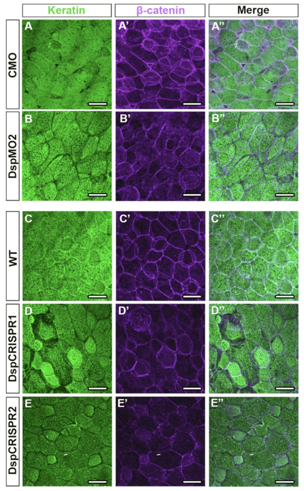 Supplemental Figure 6: Decreased Dsp results in cortical gaps in keratin localization. A-Eââ) Immunofluorescence of keratin (green) in the epidermis of Dsp morphants and mutants. Beta-catenin (purple) labeling was used to provide a marker of the cortical region of the cell. Scale bars = 25µm. |