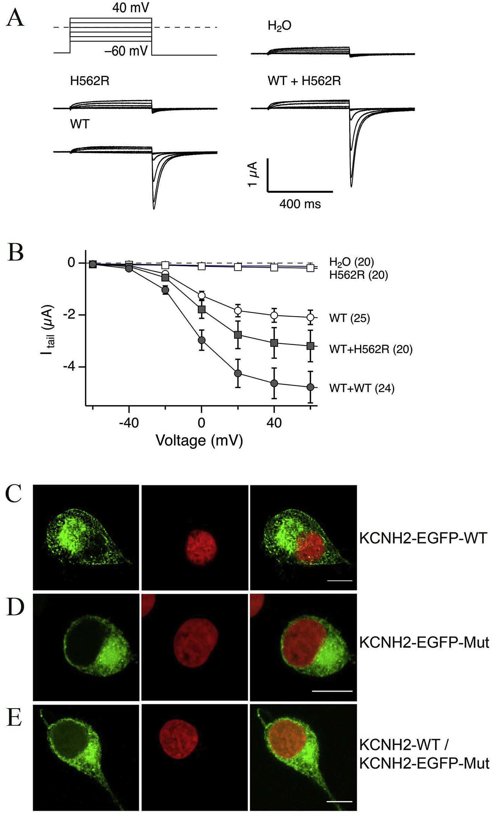 Fig. 3. Biophysical properties and membrane expression of wild-type and mutant KCNH2 subunits in Xenopus oocytes and HEK 293â¯cells. A, Protocol of measurements and results from control (H2O), homomeric KCNH2-H562R channels, wild-type channels and co-expressed KCNH2-H562R and wild-type mRNA as indicated. B, Adjusted wild-type mRNA concentration yielded about â2 μA of maximal inward tail current (open circles). Twice the concentration of wild-type mRNA (âWT + WTâ, filled circles) resulted in about twice the current amplitude indicating that the mRNA concentration did not saturate the translation machinery of the oocytes. Injection of water (control) or mutant H562R (open squares) did not yield any specific Kv11.1 channel signal. Co-expression of wild-type and mutant H562R mRNA (filled squares) resulted in current with an amplitude between a single and a double concentration of the wild-type, without noticeable alterations of current kinetics or voltage dependence. Data are means ± s.e.m. with n in parentheses. Straight lines connect data points for clarity. C, EGFP-tagged KCNH2 wild-type subunits reach the cell surface. D, Fluorescence signals of EGFP-tagged mutant subunits suggest that transport from ER to the cell surface is compromised. E, EGFP-tagged mutant subunits co-expressed with wild-type subunits lacking EGFP. Scale bars = 10 μm.