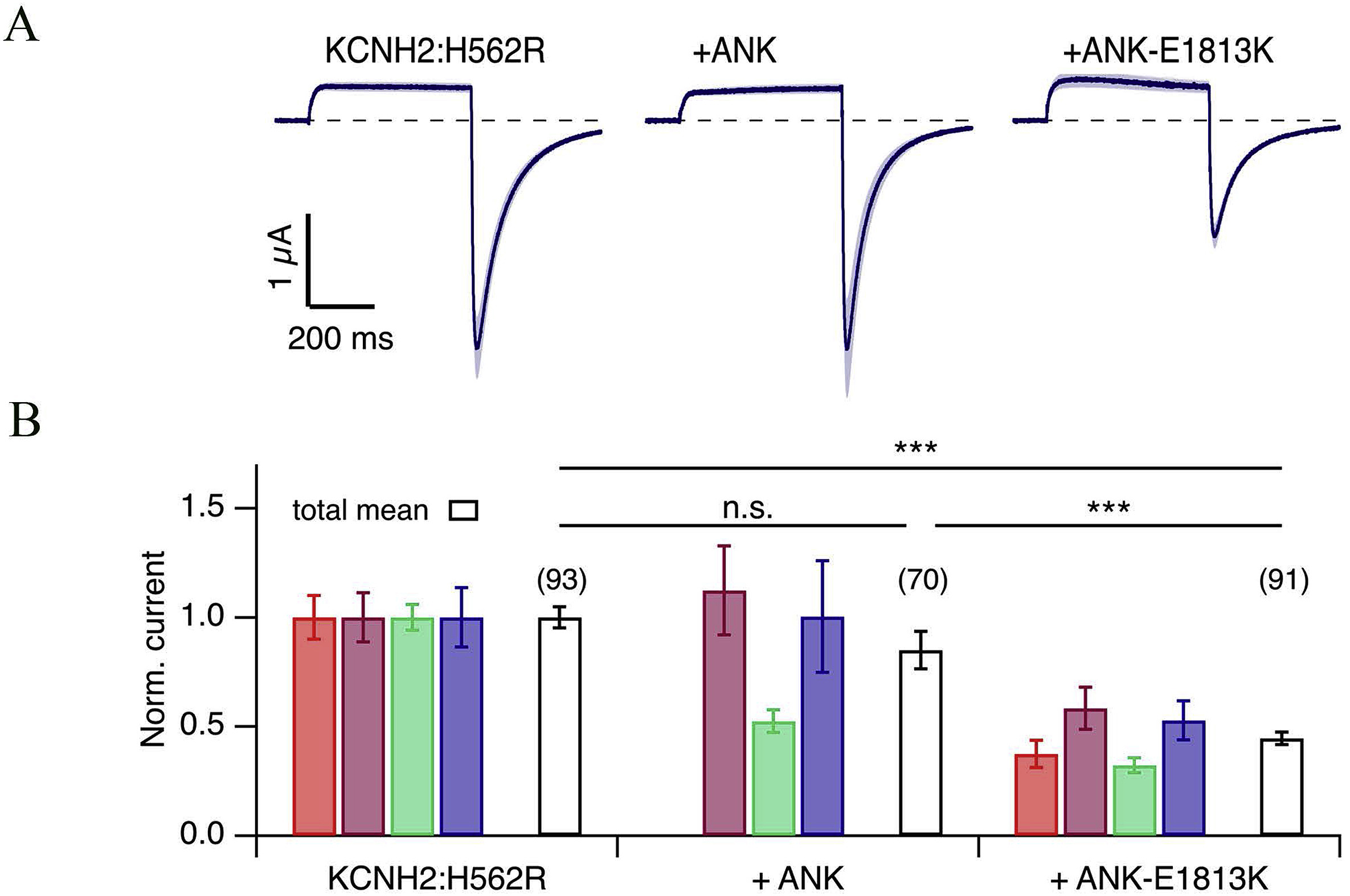 Fig. 4. Impact of ANK2-C terminus and its mutant E1813K on functional KCNH2 expression in Xenopus oocytes. A, Mean current traces obtained by depolarization to 45â¯mV with tail currents at â100 mV with the standard error value indicated by light shading (nâ¯=â¯20 each) for channels formed by KCNH2 and KCNH2-H562R (left), as well as coexpression of the C-terminal domain of ANK2 (âANKâ, middle) or its mutant E1318K (âANK-E1318Kâ, right). B, Normalized peak tail currents from experiments as in A for four independent batches of oocytes (n = 20 each). Data are means ± s.e.m. The blue bars correspond to the experiment in A, the open bars are means of all experiments. n.s. not significant; ***P < 0.001. (For interpretation of the references to colour in this figure legend, the reader is referred to the Web version of this article.)