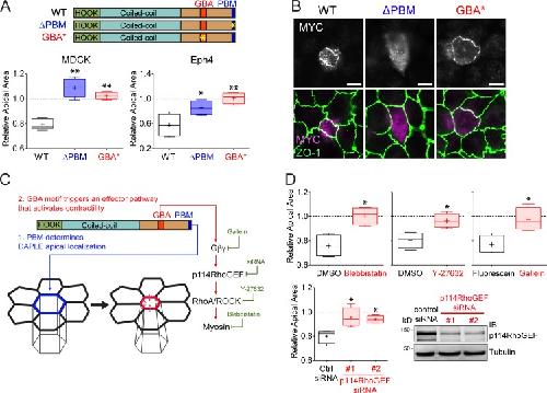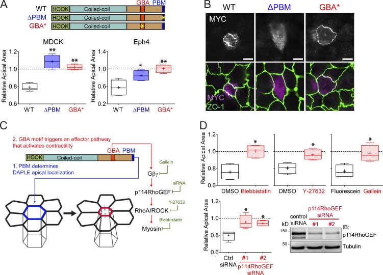 Figure 2. Both the PBM and GBA motif of DAPLE are required to promote apical cell constriction. (A) Quantification of the relative apical area of DAPLE-transfected cells compared with neighboring, untransfected cells shows that hDAPLE ÎPBM and hDAPLE GBA* mutants fail to promote apical constriction in MDCK (left) or EpH4 (right) cells. Results are presented as box-and-whiskers plots (error bars indicate minimum to maximum range) of n = 4â9 independent experiments per condition. *, P < 0.05; **, P < 0.01 using the MannâWhitney U test. (B) Confocal fluorescence microscopy pictures of MDCK cells sparsely expressing the indicated MYC-hDAPLE constructs and costained for MYC (magenta) and ZO-1 (green) show that hDAPLE GBA* mutant is enriched at apical junctions like WT, while hDAPLE ÎPBM mutant is not. Scale bars, 10 µm. (C) Diagram depicting the different functions of the PBM and the GBA motif in DAPLE-induced apical cell constriction. A possible effector pathway to promote apical cell constriction though G protein activation is shown on the right, along with the treatments used in D to test it (green). (D) Box-and-whiskers plots (error bars indicate minimum to maximum range) for the quantification of relative apical area show that DAPLE-mediated apical constriction requires the activity of myosin (inhibited by blebbistatin), ROCK (inhibited by Y-27632), free Gβγ (inhibited by Gallein, but not its inactive analogue, fluorescein) and p114RhoGEF (inhibited by siRNA). n = 4 independent experiments per condition. *, P < 0.05 using the MannâWhitney U test. The immunoblot (IB) on the bottom right shows the reduction of p114RhoGEF expression upon siRNA treatments. |