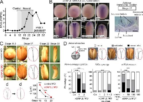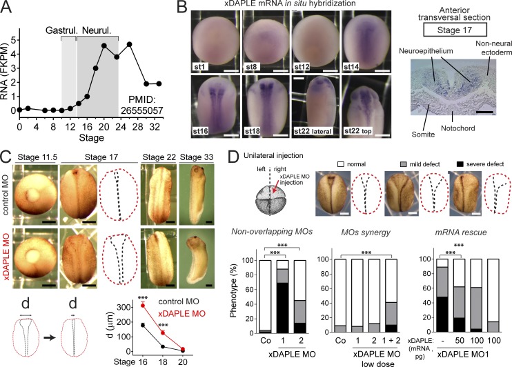 Figure 3. Loss of DAPLE delays NT closure in Xenopus. (A) Quantification of DAPLE mRNA abundance in whole Xenopus embryos at different stages by RNA sequencing showing induction during neurulation. Extracted from Peshkin et al. (2015). (B) Left: Whole-mount RNA in situ Hybridization for xDAPLE showing restricted expression in neural tissues from the onset of neurulation, but not at earlier stages (st). Right: anterior transversal section on the right shows specific expression in neuroepithelial cells. (C) xDAPLE morphants at different stages of development showing a delay in the closure of the neural plate compared with controls. Graph at the bottom shows a quantification of the distance between neural folds from 10 embryos at the indicated stages (average ± SEM). ***, P < 0.001 using the t test (two-tailed, unpaired). (D) Quantification of neural plate bending defects in embryos unilaterally injected with xDAPLE MOs and/or xDAPLE mRNA. n = 50â100 embryos per condition analyzed at stage 17. ***, P < 0.001 using the Ï2 test. Validation of xDAPLE MOs is shown in Fig. S2. All scale bars represent 250 µm, except the one in the transversal section in B, which represents 50 µm. |