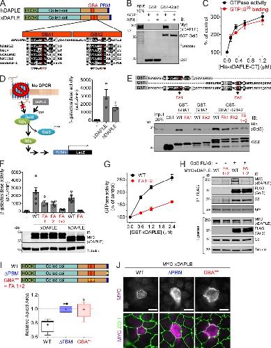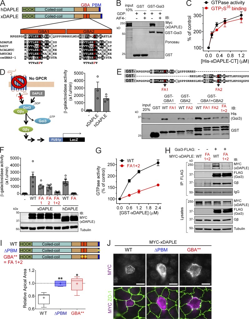 Figure 5. xDAPLE promotes G protein signaling and apical cell constriction via two GBA motifs in tandem. (A) Comparison of domain composition of hDAPLE and xDAPLE, and alignment of xDAPLE GBA1 and GBA2 with other GBA motifs. ce, C. elegans; h, Homo sapiens. (B) Full-length xDAPLE from HEK293T cell lysates binds to immobilized GST-Gαi3 when the G protein is loaded with GDP (inactive), but not when it is loaded with GDP-AlF4â. (C) Steady-state GTPase (black) and GTPγS binding (red) experiments showing that purified His-xDAPLE-CT accelerates nucleotide exchange of purified His-Gαi3. Results are the average ± SEM of n = 3 experiments. (D) xDAPLE-CT and hDAPLE-CT activate G protein signaling in a yeast-based β-galactosidase reporter assay. Diagram on the left depicts the pathway activated by DAPLE in yeast lacking the cognate GPCR and with the endogenous G protein replaced by human Gαi3. Results on the right are the average ± SEM of n = 3 experiments. (E) Proteinâprotein binding experiment showing that purified His-Gαi3 binds to both GBA1 and GBA2 of xDAPLE. Diagram on the top shows a detail of the sequence of the purified GST-fused xDAPLE constructs used in the experiment and the position of FA point mutations (in red). (F) G protein activity assays in yeast (as in D) show that both GBA1 and GBA2 have to be mutated simultaneously to abolish xDAPLE-mediated activation. Results are the average ± SEM of n = 5 experiments. (G) Steady-state GTPase experiments showing that activation of purified His-Gαi3 by GST-xDAPLE FA1+2 (red) is impaired compared GST-xDAPLE WT (black). Results are the average ± SEM of n = 3 experiments. Basal activity = 0.16 mol Pi/mol Gαi3/15 min. (H) Coimmunoprecipitation (IP) experiments showing that xDAPLE WT, but not xDAPLE FA1+2 mutant, binds to Gαi3-FLAG when expressed in HEK293T cells. Immunoblots (IB) of the FLAG IPs are shown on the top and equal aliquots of the starting lysates used for it are shown on the bottom. (I) Box-and-whiskers plots (minimum to maximum) for the quantification of relative apical area show xDAPLE ÎPBM and xDAPLE GBA** (FA1+2) mutants fail to promote apical constriction in MDCK cells compared with xDAPLE WT. Results are from n = 4â9 independent experiments. *, P < 0.05; **, P < 0.01 using the MannâWhitney U test. (J) Fluorescence microscopy pictures of MDCK cells sparsely expressing the indicated MYC-xDAPLE constructs and costained for MYC (magenta) and ZO-1 (green) show that xDAPLE GBA** mutant is enriched at apical junctions like WT, while xDAPLE ÎPBM mutant is not. Scale bars, 10 µm. |