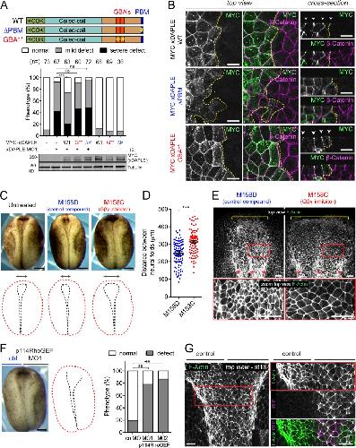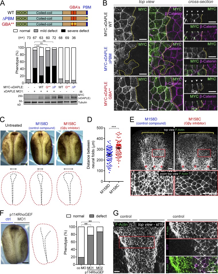 Figure 6. Activation of G protein signaling by xDAPLE is required for apical cell constriction during neurulation. (A) Quantification of neural plate bending defects in embryos unilaterally injected with xDAPLE MO and/or xDAPLE mRNAs as in Fig. 3 D shows that xDAPLE WT, but neither ÎPBM (ÎP) nor GBA** (G**), rescues neural plate bending defects upon xDAPLE depletion. The number (n) of embryos per condition in indicated above the bars. ***, P < 0.001 or not significant (ns) using the Ï2 test. (B) Confocal fluorescence microscopy pictures of the neural plate of Xenopus embryos unilaterally injected with MYC-xDAPLE mRNA and costained for MYC (green) and β-catenin (magenta). The left and middle panels correspond to a view on the neuroepithelium from the top, and panels on the right are optical cross sections. The yellow dotted line separates the injected from the uninjected side of the neuroepithelium. Scale bars, 20 µm. (C) Morphology of Xenopus embryos at stage 16 after treatment with the Gβγ inhibitor M158C or its inactive analogue, M158D. Scale bars, 250 µm. (D) Scatterplot for the quantification of the distance between neural folds from 90 embryos treated with M158D or M158C (average ± SEM). ***, P < 0.001 using the t test (two-tailed, unpaired). (E) Whole-mount F-actin staining of Xenopus embryos at stage 17 after treatment with the Gβγ inhibitor M158C or its inactive analogue, M158D. Red boxes in the top panels are magnified in the bottom panels to show the enlarged area of the neuroepithelial cells treated with M158D compared with M158C. Scale bars, 50 µm. (F) Quantification of neural plate bending defects in embryos unilaterally injected with p114RhoGEF MO1 (splicing-interfering, validated in Fig. S5) and p114RhoGEF MO2 (translation blocking). n = 80 embryos analyzed at stage 17. ***, P < 0.001 using the Fisher exact test. Scale bars, 250 µm. (G) Whole-mount F-actin staining (green) of Xenopus embryos unilaterally coinjected with p114RhoGEF MO1 and a lineage tracer (GFP-CAAX, magenta). The red box in the left panel is magnified in the panels on the right to show the enlarged area of the neuroepithelial cells depleted on p114RhoGEF compared with the control sides. Scale bars, 50 µm. All images presented in this figure are representative results of n ⥠3 experiments. |
