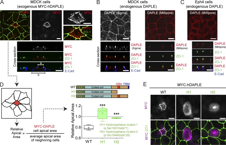 Figure 1. DAPLE localizes to apical cell junctions and promotes apical cell constriction. (A) Confocal fluorescence microscopy pictures of MDCK cells sparsely expressing ectopic MYC-hDAPLE costained for MYC (red), ZO-1 (green), and E-cadherin (blue). Top panels correspond to a view on the monolayer from the top, and panels on the bottom are optical cross sections of the monolayer. a and b segments correspond to the width of the apical and basal cell membrane domains. (B and C) Confocal fluorescence microscopy pictures of MDCK (B) or EpH4 (C) cell monolayers stained for DAPLE (Sigma-Aldrich or Millipore antibody, red), ZO-1 (green), and E-cadherin (blue) as indicated. The top panels correspond to views on the cell monolayers from the top, and panels on the bottom are optical cross sections of the monolayers. (D) Quantification of the relative apical area of DAPLE-transfected cells compared with neighboring, untransfected cells shows that hDAPLE WT, but not hydrocephalus-associated mutants (H1 and H2), cause apical constriction in MDCK cells. Results are presented as box-and-whiskers plots (minimum to maximum) of n = 5â9 independent experiments per condition. ***, P < 0.001 using the MannâWhitney U test. (E) Fluorescence microscopy pictures of MDCK cells sparsely expressing the indicated MYC-hDAPLE constructs and costained for MYC (magenta) and ZO-1 (green) show that H1 and H2 mutants are not enriched at apical cell junctions like WT. Scale bars, 10 µm. |