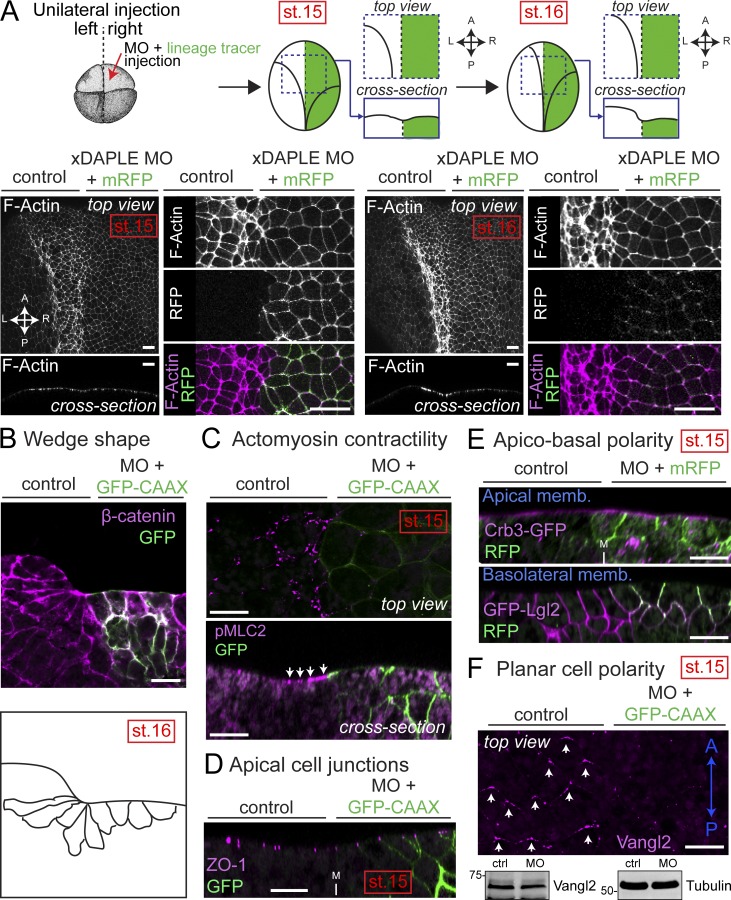 Figure 4. Loss of DAPLE in Xenopus causes apical constriction defects during neurulation. (A) Whole-mount F-actin staining (magenta) of Xenopus embryos unilaterally coinjected with xDAPLE MO and a lineage tracer (mRFP or GFP-CAAX, green) showing enlarged apical surface of DAPLE-depleted neuroepithelial cells compared with uninjected control sides at stages 15 and 16. (B) Transversal cryosection stained for β-catenin (magenta) of the anterior neural plate of an embryo at stage 16 unilaterally coinjected with xDAPLE MO and a lineage tracer (GFP-CAAX, green). Outlines of cell borders are depicted in the bottom to show the lack of wedge shape morphology in the outer layer of neuroepithelial cells depleted of DAPLE. (CâF) Whole-mount pMLC2 (C), ZO-1 (D), GFP (E), and Vangl2 (F) staining (magenta) of Xenopus embryos unilaterally coinjected with xDAPLE MO and a lineage tracer (GFP-CAAX or mRFP; green). In E, embryos were bilaterally injected with Crb3-GFP (top) or GFP-Lgl2 (bottom). In F, staining for the lineage tracer (mRFP) is not shown for clarity, and an immunoblot from dissected neural plates is shown in the bottom. xDAPLE depleted sides show defective staining for actomyosin contractility and PCP markers at stage 15, while markers of apical cell junctions or apicobasal polarity are not changed. All images presented in this figure are representative results of n ⥠3 experiments. All scale bars represent 25 µm, except those in A, which represent 50 µm. |