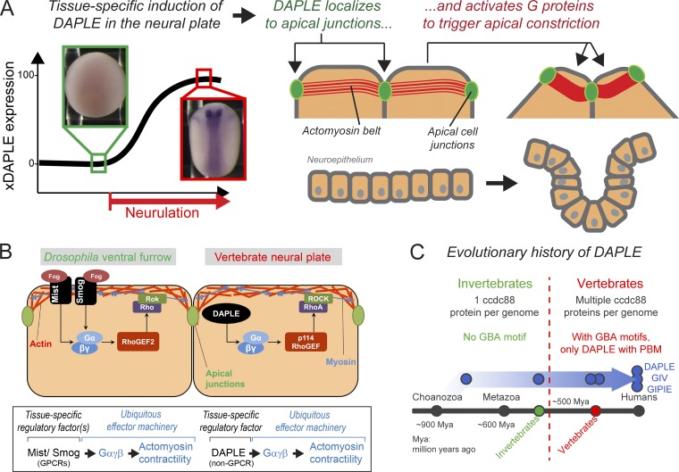 Figure 7. Mechanism of G proteinâmediated regulation of apical cell constriction during neurulation by the non-GPCR protein DAPLE. (A) Expression of DAPLE is specifically induced during neurulation. Upon expression, DAPLE localizes to apical cell junctions of neuroepithelial cells, where it triggers G protein activation that leads to apical cell constriction and the subsequent bending of the neural plate. (B) Theme and variations of G proteinâregulated apical cell constriction during epithelial tissue morphogenesis in vertebrates versus invertebrates. Heterotrimeric G proteins are part of a conserved ubiquitous machinery that controls actomyosin contractility, but they are regulated differently across species. In vertebrates, DAPLE fulfills the role performed by GPCRs in invertebrates as tissue-specific activators of signaling that drives apical cell constriction. (C) The G protein regulatory function of DAPLE (i.e., its GBA motif) was acquired during evolution in the transition from invertebrates to vertebrates, suggesting that the unconventional mechanism of G protein activation described here is an evolutionary innovation for epithelial remodeling in vertebrates. |