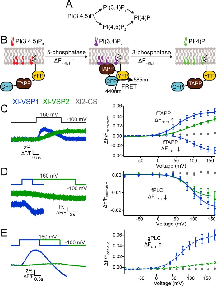 A voltage-sensing phosphatase, Ci-VSP, which shares sequence identity with PTEN, dephosphorylates phosphatidylinositol 4,5-bisphosphate.