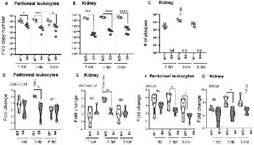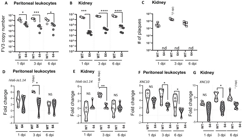 Figure 2. Magnitude of iVα6 T cell response in adult frogs is associated to the level of viral replication and production of infectious particles. PLs and kidneys were collected at 1, 3, and 6 dpi from adult frogs infected with 1 × 106 PFUs of WT-or ∆64-FV3. FV3 genome copy number by absolute qPCR in PLs (A) and kidneys (B) were determined. The total number of infectious particles (nd: not detected) in the kidney was determined by plaque assay (C).Gene expression of iVα6-Jα1.43 and XNC10 in PLs (D,F) and kidneys (E,G) were determined relative to an endogenous control (GAPDH) and fold changes were calculated using mock-infected frogs as a control. Each dot represents an individual animal (n = 4–5). The line intersecting the y-axis at 0 represents the APBS control that the fold changes of the treatments are in relation to. Note: * p < 0,05; ** p < 0.01; *** p < 0.001, and **** p < 0.0001 above the line denotes statistically significant differences between the different treatment groups; significant differences between time points within each treatment group are indicated within parentheses; NS indicates no significant differences (one way ANOVA and Dunns’s multiple comparison test).