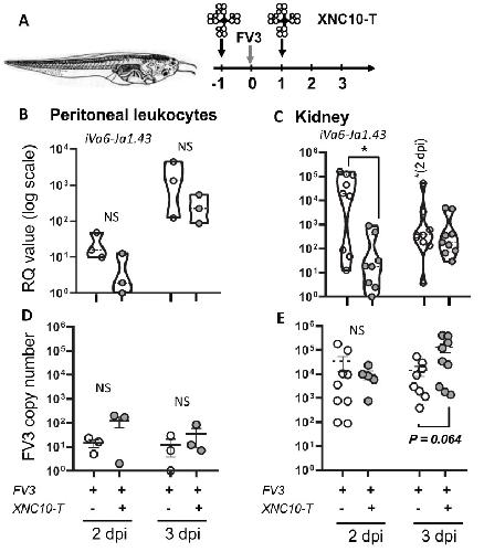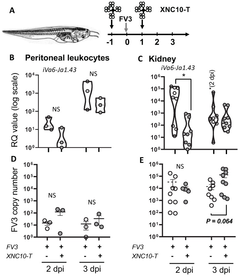 Figure 4. XNC10 tetramer-mediated iVα6T cell depletion in tadpoles affects iVα6-Jα1.43 transcript levels and viral replication. PLs and kidneys were collected from three week-old (stage 55) tadpoles that had been injected with 1 μg XNC10 tetramers (XNC10-T) or vehicle control 1 day pre, and 1 day post i.p. injected with 10,000 PFUs of FV3, at the indicated time points (n = 9). A schematic of the injection regime is shown in (A). Gene expression of iVα6-Jα1.43 in PLs (B) and kidneys (C) is shown. Results are normalized to an endogenous control and presented as relative expression compared with the lowest observed value according to the ââCt method. FV3 loads in PLs (D) and kidneys (E) were measured using absolute qPCR with primers against FV3 polymerase II. For PLs, each dot represents a pool of 3 tadpoles, while for kidneys, each dot represents a single tadpole; * p < 0.05 denotes statistically significant differences between the indicated groups; NS indicates no significant differences (One way ANOVA followed by Tukeyâs multiple comparison test).