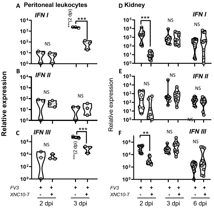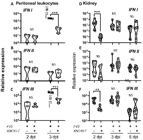 Figure 7. XNC10 tetramer treatment results in a delayed antiviral response in the peritoneal cavity and kidneys of FV3 infected tadpoles. PLs and kidneys were collected from three week-old (stage 55) tadpoles that had been injected with 1 μg XNC10 tetramers (XNC10-T) or vehicle control 1 day pre- and 1 day post-i.p. injection with 10,000 PFUs of FV3, at the indicated time points (n = 8–9). Quantitative gene expression analysis of type I (A,D), type II (B,E), and type III IFN (C,F) were determined relative to a endogenous control (GAPDH), and relative expression was calculated against the lowest observed expression according to the ∆∆Ct method (n = 9); * p < 0.05, ** p < 0.005, and *** p < 0.001 above the line denote statistically significant differences between the different treatment groups; significant differences between time points within each treatment group is indicated within parentheses; NS indicates no significant differences (One way ANOVA followed by Tukey’s multiple comparison test).