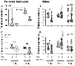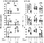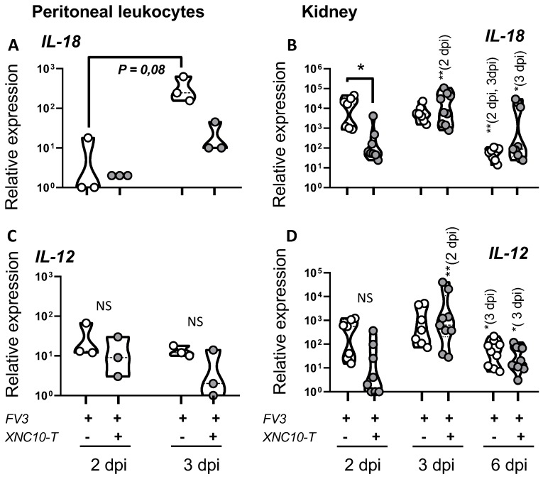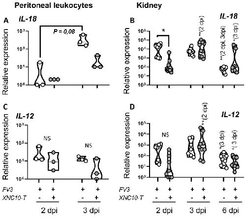 Figure 8. Effects of iVα6T cell depletion on IL-18 and IL-12 responses. PLs and kidneys were collected from three week-old (stage 55) tadpoles that had been injected with 1 μg XNC10 tetramers (XNC10-T) or vehicle control 1 day pre- and 1 day post-i.p. injection with 10,000 PFUs of FV3, at the indicated time points (n = 8–9). Quantitative gene expression of IL-18 (A,B) and type IL-12 (C,D) was determined relative to an endogenous control (GAPDH) and relative expression was calculated against the lowest observed expression according to the ∆∆Ct method (n = 9); * p < 0.05; ** p < 0.005, above the line denotes statistically significant differences between the different treatment groups; significant differences between time points within each treatment group is indicated within parentheses; NS indicates no significant differences (One way ANOVA followed by Tukey’s multiple comparisons test).