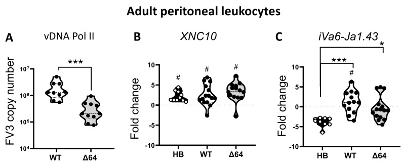 Figure 1. Effects of infection with attenuated knockout (KO) FV3 recombinant or bacterial stimulation on iVα6 T cell response. Peritoneal leukocytes (PLs) were collected at 1 dpi from adult frogs infected with 1 × 106 PFUs of WT-FV3 or ∆64-FV3, or 100 µl heat-killed (HB) E. coli. (A) Genome copy number using absolute qPCR with primers against FV3 DNA polymerase II. (B) XNC10 relative gene expression and (C) iVα6-Jα1.43 relative gene expression. Gene expression was determined relative to an endogenous control (GAPDH) and fold changes were calculated using the unstimulated sample (injected with equivalent volume of APBS) collected at the same time point. Data are pooled from three independent experiments with n = 4–5 animals in each experiment and each dot represents an individual animal. The line intersecting the y-axis at 0 represents the unstimulated control that the fold changes of the treatments are in relation to; (#) p < 0.05 significant differences compared to unchallenged (APBS) injected controls; (*) p < 0.05 and (***) p < 0.001 statistically significant differences between the indicated groups (one way ANOVA and Dunns’s multiple comparison test).