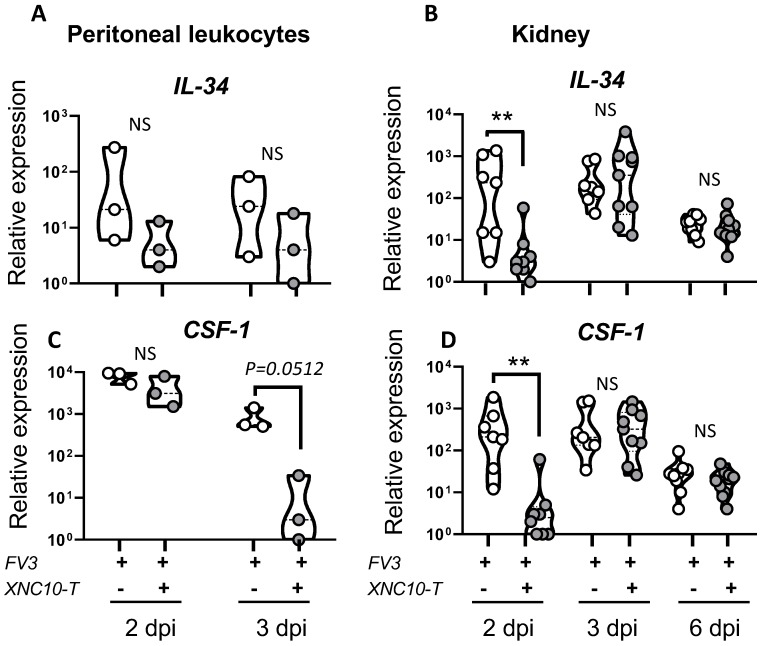 Figure 6. Effect of XNC10 tetramer treatment on the expression of the macrophage stimulating factor genes CSF-1 and IL-34 in the peritoneal cavity and kidneys of FV3 infected tadpoles. PLs and kidneys were collected from three week-old (stage 55) tadpoles that had been injected with 1 μg XNC10 tetramers or vehicle control 1 day pre- and 1 day post-i.p. injection with 10,000 PFUs of FV3, at the indicated time points (n = 8â9). Quantitative gene expression analysis of IL-34 (A,B) and CSF-1(C,D) were determined relative to a endogenous control (GAPDH), and relative expression was calculated against the lowest observed expression according to the ââCt method (n = 9); ** p < 0.005 above the line denotes statistically significant differences between the different treatment groups; NS indicates no significant differences (One way ANOVA followed by Tukeyâs multiple comparison test).