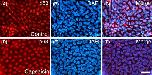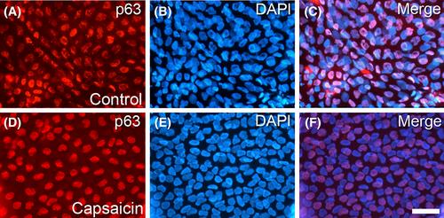 A–F: Effects of capsaicin treatment and ΔNp63 labeling of central cornea epithelium. A: ΔNp63‐labeled (red fluorescence) cells of the basal layer of the cornea epithelium. B: Corresponding image to that shown in A of DAPI‐labeled nuclei (blue fluorescence). C: Merged image from A and B. Note the overlapping ΔNp63 and DAPI nuclear labeling in basal epithelial cells. D–F: Central region of capsaicin‐treated cornea epithelium. D: Normal‐appearing ΔNp63‐labeled cells (red fluorescence) in the basal epithelial layer. E: Corresponding image to that shown in D of DAPI nuclear label (blue fluorescence). F: Merged image of D and E, with overlapping nuclear and ΔNp63 labeling in the basal cells, which appears similar to the control shown in A–C. Scale bar in F = 20 μm