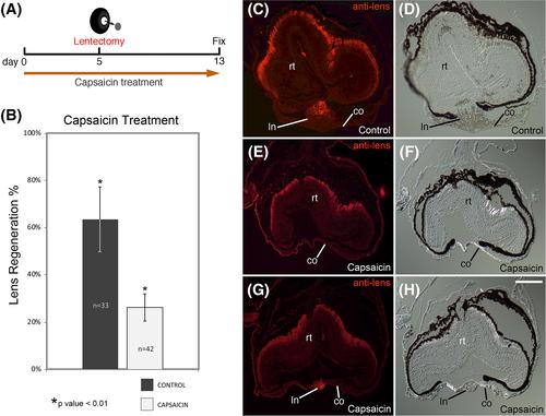Capsaicin treatment inhibits Xenopus lens regeneration. A: Timeline of the capsaicin treatments in conjunction with the lentectomy procedure to remove the lens. Time (days) is represented along the horizontal axis. B: Graphical results of the lens regeneration rates following capsaicin treatment, as compared to control larvae. CâD: Transverse section of eye region of a control, untreated tadpole undergoing lens regeneration (st 52). C: Antiâlens antibody labeling of control regenerated lens (red fluorescence). D: Corresponding DIC image of that shown in A. EâH: Transverse section of eye region from capsaicinâtreated tadpoles (st 52). E: Antiâlens antibody labeling of representative capsaicinâtreated larvae challenged to regenerate the lens, following original lens removal. As seen in most cases, no lens regeneration is apparent. F: Corresponding DIC image to that shown in D. G: Antiâlens antibody labeling of capsaicinâtreated larvae that were able to regenerate a small lens (red fluorescence). H: DIC image corresponding to section shown in G. Abbreviations: co, cornea; ln, lens; rt, retina. *â= P value <0.01. Scale bar in CâHâ=â140âμm