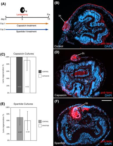 Ex vivo Xenopus lens regeneration assay results following capsaicin or Spantide II treatment. A: Summary timeline of treatments in conjunction with the lentectomy procedure to remove the lens. Capsaicin treatment (Exp 1) is represented in orange and Spantide II treatment (Exp 2) is represented in blue. Time (days) is represented along the horizontal axis. B: Transverse section of control, untreated eye showing merged images of regenerated lens body stained with anti‐lens antibody (red fluorescence) and nuclei stained with DAPI (blue fluorescence). C: Graphical representation of the results of the ex vivo lens regeneration experiments in controls vs capsaicin‐treated cultures. D: Transverse section of larva treated with capsaicin, showing merged image of regenerated lens body. E: Graphical representation of ex vivo lens regeneration experiments in controls vs Spantide II–treated cultures. F: Transverse section of ex vivo cultured eye in Spantide II containing media, showing a regenerated lens body. Abbreviations: ln, lens; rt, retina. Scale bar in B,D,F = 140 μm