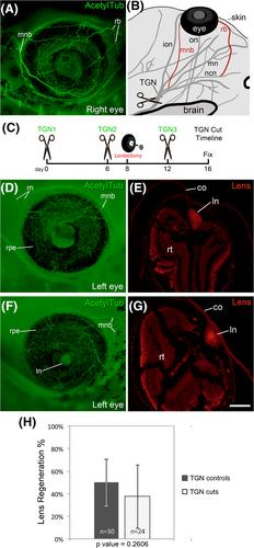 Severing of the TGN and its effects on lens regeneration. A: Normal innervation of the larval Xenopus cornea (st 52) labeled with antiâacetylated alphaâtubulin antibody (green fluorescence). B: Schematic diagram of Xenopus cranial innervation on the left side of the head. The TGN branches from the brain and travels through the head region, where some branches serve the cornea (red branches; see Perry et al., 2013 for full description). The site containing the main nervetrunk that was severed for nerve cut experiments is noted with scissors. C: Time line of the TGN cutting experiments in conjunction with the lentectomy procedure to remove the lens. Time (days) is represented along the horizontal axis. D: Xenopus cornea labeled with antiâacetylated alphaâtubulin antibody (green fluorescence) at the end of the TGN cutting/lens regeneration experiment outlined in C. Note reduced labeling of main nerve branches and significantly reduced nerve structures in the central cornea region, as compared to A. Some fibers from both the mandibular nerve and the recurrent branch of the nasociliary nerve are seen. E: Representative transverse section from eye presented in D. The regenerated lens is labeled with antiâlens antibody (labeled with ln; red fluorescence). F: A second case showing an antiâacetylated alphaâtubulinâlabeled (green fluorescence) cornea at the end of the TGN cutting/lens regeneration experiment outlined in C. Note little if any innervation from the mandibular nerve on the posterior side (left), but some innervation from the nasociliary nerve is present on the anterior side (right). G: Representative transverse section from eye presented in E, where the regenerated lens has been labeled with antiâlens antibody (labeled with ln; red fluorescence). H: Graphical representation of lens regeneration rates following TGN cuts compared to control animals without TGN cuts. Abbreviations: co, cornea; ion, infraorbital nerve; ln, lens; mn, mandibular nerve; mnb, mandibular nerve branch; on, optic nerve; rb, recurrent nerve branch; rt, retina; TGN, trigeminal nerve. P valueâ=â0.2606. Error bars represent SD. Scale bar in A,D,Fâ=â105âμm. Scale bar in E,Gâ=â140âμm