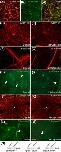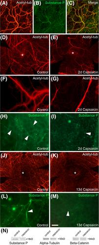 Effects of capsaicin treatment on Xenopus corneal innervation. Acetylated tubulin labeling is visualized with red fluorescence, and Substance P labeling with green fluorescence. AâC: Central area of corneaepithelium. A: Antiâacetylated tubulinâlabeled nerves of control corneaepithelium. B: Corresponding image to A showing subset of Substance Pâlabeled nerves. C: Merged image from A and B, showing both acetylated tubulinâ and Substance Pâlabeled nerves. D: Acetylated tubulinâlabeled control cornea epithelial pelt, showing the entire region that overlies the eye. Large nerve trunks radiate finer branches toward the central cornea region (the latter noted with asterisk). E: Capsaicinâtreated cornea epithelial pelt (two days of treatment) showing a reduced number of acetylated tubulinâlabeled nerve branches radiating into the central cornea (asterisk), as well as reduction in the nerve trunks around the periphery. F: Higher magnification of acetylated tubulin labeling within the control corneaepithelium. G: Acetylated tubulin labeling of the capsaicinâtreated cornea (two days of treatment). Note reduced density of labeled fibers. H: Substance Pâlabeled control cornea, corresponding to the same region shown in F. The white arrowheads point out Substance Pâlabeled fibers that overlap with acetylated tubulinâlabeled nerve fibers. I: Substance P labeling of the twoâday capsaicinâtreated cornea, corresponding to the same region shown in G. Substance P is visibly reduced along the acetylated tubulinâlabeled nerve fiber shown in G (noted with white arrowhead). JâM: Representative corneas from the conclusion of the capsaicin treatment experiment (eight days of treatment). J: Acetylated tubulinâlabeled control cornea pelt. K: Capsaicinâtreated cornea pelt, labeled with acetylated tubulin. Note the reduced density of fibers in the central region (compared with J). L: Substance Pâlabeled control corneaepithelium. M: Greatly reduced Substance P labeling of a capsaicinâtreated corneaepithelium (compared with L). N: Western blot analysis of control vs fiveâday capsaicinâtreated corneas. An observable reduction was noted in protein levels of alphaâtubulin (50kD) and Substance P (18kD) proteins. Betaâcatenin (94kD) was used as a loading control. Scale bar in AâCâ=â24âμm. Scale bar in D,E,J,Kâ=â50âμm. Scale bar in FâI,L,Mâ=â12âμm