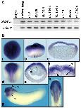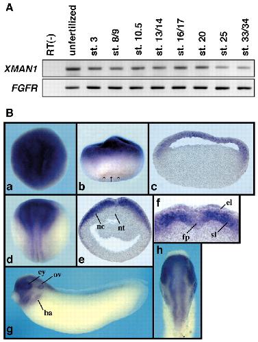 Fig. 3. Temporospatial expression of XMAN1. (A) Analysis of temporal expression pattern of XMAN1 by RT-PCR with RNA from various developmental stages. FGFR, a loading control. (B) Whole-mount in situ analysis of Xenopus embryos at early gastrula (a-c), neurula (d-f) and tadpole (g,h) stages. c and e show cross-sections of b and d, respectively. f represents a close view of the dorsal region of e. h shows a dorsal view of the head region of g. Arrows, dorsal blastopore groove. nc, neural crest; nt, notochord; fp, floor plate; el, epithelial layer; sl, sensory layer; ey, eye; ov, otic vesicle; ba, branchial arches.