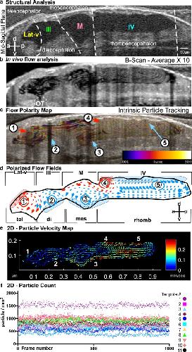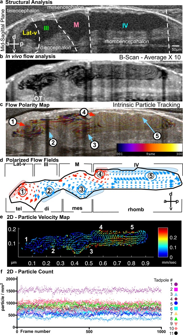 Figure 2. Imaging ventricular CSF flow with OCT. (a) Mid-sagittal view of the brain allowing simultaneous visualization of the four ventricles. (b) B-scan image acquisition using OCT: Ventricles of a stage 45 tadpole harbor native free floating particles. In this image, the spatial position of the particles are recorded over time to demonstrate discrete flow patterns within each ventricle (OT: optical tectum). (c) Intrinsic Particle Tracking: Using ImageJ, we tracked particles using 300 frames of 2D images. Temporal color coding depicts their trajectory over time. Color bar represents color versus corresponding frame number in the color-coded image. Based on the trajectory map, 5 distinct flow fields were observed: FF1-FF5. We numbered flow fields 1 to 5 along the anterior-posterior axis. FF 1-Telencephalic flow and FF 2-Diencephalic flow are in the lateral ventricle. FF 3-Mesencephalic flow is in the 3rd ventricle. Finally, the 4th ventricle has 2 flow fields: FF 4-Anterior Rhombencephalic flow and FF 5-Posterior Rhombencephalic flow. (d) Outline of the ventricular system and vector maps of the CSF flow fields. Based on the trajectory map and real time observation (Movie 3); FF1 and FF4 are clockwise and FF2, 3 and 5 are counter-clockwise. (e) 2D Particle Velocity Map: Particle trajectories averaged across all frames (1000) to form flow velocities (see methods for details). Based on the particle velocity map and real time observations FF1 and FF2 are relatively slower compared to FF 3, 4 and 5. The fastest flow is recorded within the 4th ventricle. (f) 2D Particle Count (nâ=â11): Over 1000 frames, total particle number are counted for 11 different wild type tadpoles and plotted for each frame.