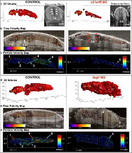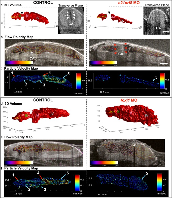 Figure 3. Characterization of c21orf59 and foxj1 morphants. (a) 3D rendering of the tadpole ventricular system shows aqueductal stenosis and a smaller ventricular system in c21orf59 morphants compared to controls and (b,c) flow polarity and particle velocity maps confirm loss of FFs 1-4 as well as diminished flow in FF5. (d) 3D rendering of the tadpole ventricular system shows ventriculomegaly in foxj1 morphants and (e,f) flow polarity and particle velocity map confirm loss of FFs1-4 and slow FF5. (Lat-V: lateral ventricle, III: 3rd ventricle, M: Midbrain ventricle, IV: 4th ventricle).