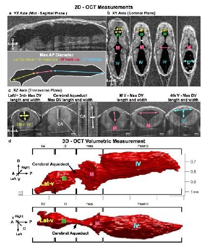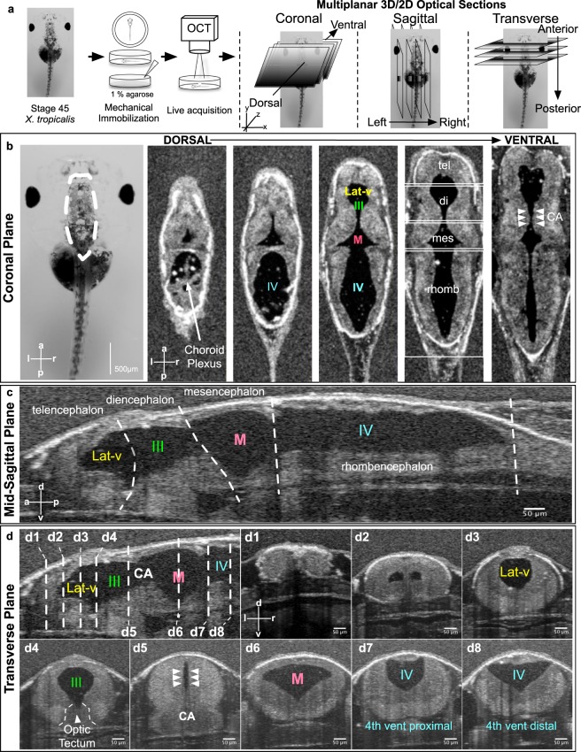Figure 1. In Vivo OCT imaging of the Xenopus tadpole ventricular system. (a) Stage 45 tadpoles are embedded in 1% low-melt agarose with the dorsal side of the animal facing the OCT beam. 2D and 3D images are taken. (b) A stage 45 tadpole as seen under light microscopy. Far left panel - white dotted line outlines the brain. A series of OCT images taken at progressively more ventral planes show the ventricular system with different parts of the brain. (c) A mid-sagittal view of the ventricular system at the midline. White dotted lines show the boundaries between different brain regions. (d) Transverse sections through the ventricular system along the anterior to posterior axis of the animal (d1âd8). The position of each section corresponds to the white dotted lines shown on the mid-sagittal view in the top left panel. (Lat-V: lateral ventricle, III: 3rd ventricle, M: Midbrain ventricle, IV: 4th ventricle, tel: Telencephalon, di: Diencephalon, mes: Mesencephalon, rhomb: Rhombencephalon, CA: Cerebral aqueduct).