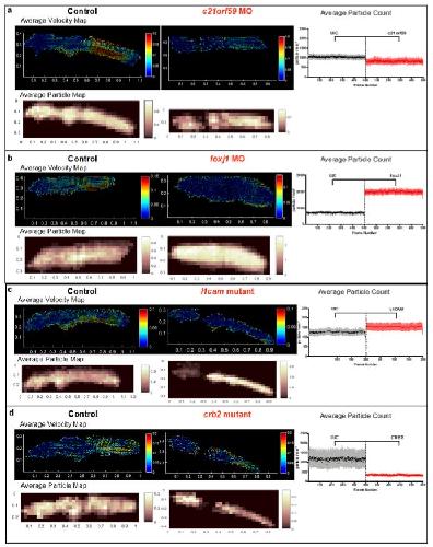 (b) Average velocity map for foxj1 morphants show slower particle velocities. Average particle maps show uniformly distributed particles across the ventricles. Total particle counts were significantly higher in morphants.