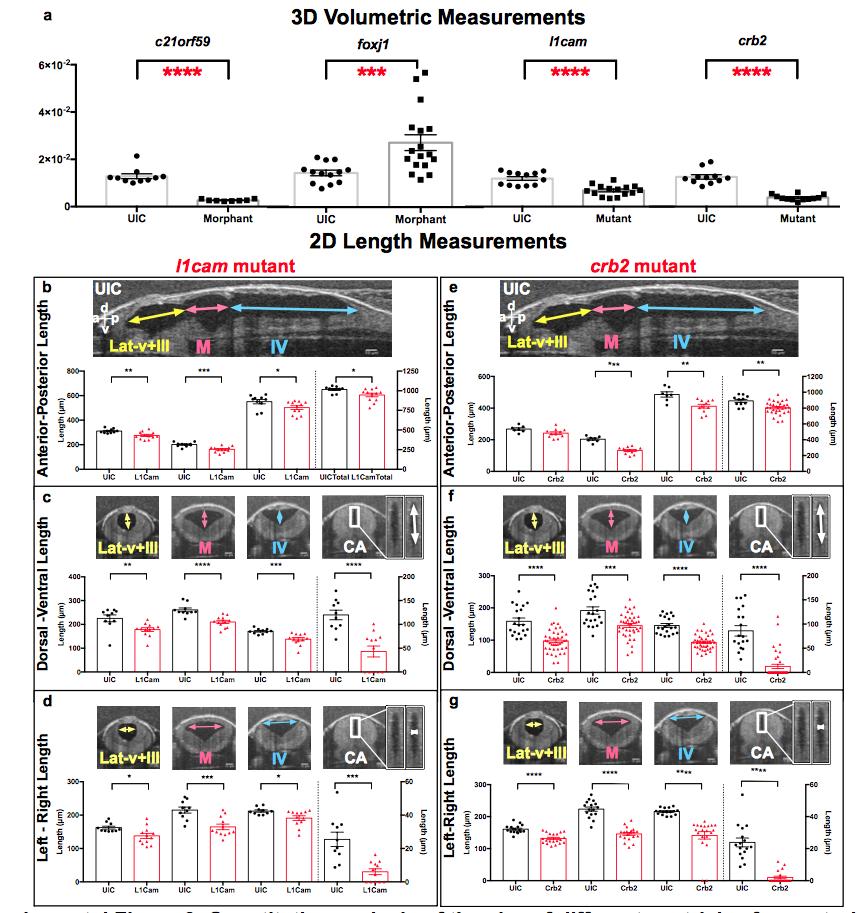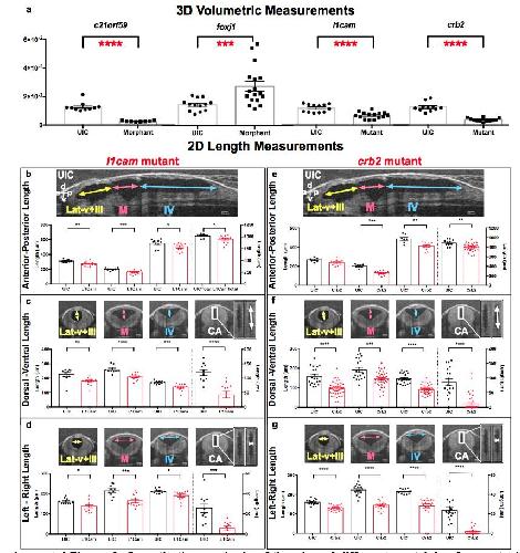 (a) Comparison of 3D volumetric measurements for the ventricular system for c21orf59 and foxj1 morphants and l1cam and crb2 F0 CRISPR mutants with their respective controls. (n=10-20). Schematic representation of position of 2D measurements taken on the control vs. l1cam (left column) and crb2 (right column) F0 CRISPR mutant ventricles are shown at the start of each panel. (b, e) Anterior-posterior length measurements: Mutants show reduced length for individual ventricles as well as of the entire ventricular system.