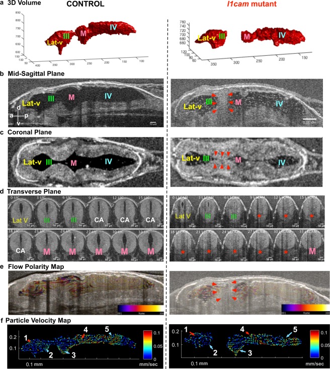 Figure 4. F0 CRISPR mutation in L1CAM causes cerebral aqueduct stenosis. The left column shows control and right column shows l1cam F0 CRISPR mutant images for all panels. (a) 3D rendering of the tadpole ventricular system shows aqueductal stenosis and a smaller ventricular system in l1cam F0 CRISPR mutant. (b) Mid sagittal view and (c) Coronal view of control and l1cam F0 CRISPR mutant, the later showing stenosis of the cerebral aqueduct (red arrowheads). (d) Transverse view of the control and l1cam F0 CRISPR mutant, starting at the end of the lateral ventricle through the cerebral aqueduct and ending in the midbrain ventricle. Control embryo shows normal opening of the duct whereas the mutant shows complete blockage (red star). (e) Relatively normal ciliary flow fields in the control and mutant animals. (f) 2D Particle Velocity Map shows intact FFs 1-5. (Lat-V: lateral ventricle, III: 3rd ventricle, M: Midbrain ventricle, IV: 4th ventricle).