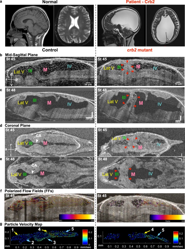 Figure 5. Hydrocephaly phenotype with CRB2 mutations. (a) CT scan of a normal brain and patient brain, with enlargement of the brain ventricles. (b) Mid-sagittal view (d) Coronal view using OCT shows reduction in ventricular size along with CA stenosis in crb2 F0 CRISPR mutant tadpole brain at stage 45 as compared to controls. (c) Mid-sagittal view (e) Coronal view of control and crb2 F0 CRISPR mutant tadpole raised to stage 48 shows enlargement of the ventricles as compared to controls. This result was seen in 3 animals that survived to this later stage. (White arrow head â CA, red arrowheads â stenosis of CA). (f) Stage 45 tadpole particle tracking shows the impairment of the flow fields in the lateral 3rd and midbrain ventricles, but normal flow in the fourth ventricle for the crb2 F0 CRISPR mutant as compared to the control. (g) 2D Particle Velocity Map shows loss of FFs 1-3 and intact FFs 4-5. (Lat-V: lateral ventricle, III: 3rd ventricle, M: Midbrain ventricle, IV: 4th ventricle).
