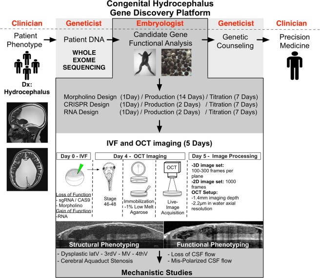 Figure 6. Schematic representation of the gene discovery platform for screening novel developmental hydrocephaly genes using Xenopus and OCT as a model system.
