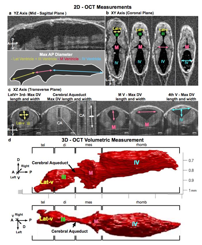 (c) Transverse view (XZ axis): DV height and Left-Right (LR) width for each of the ventricle is shown when moving from anterior to the posterior of the animal. The Lateral and 3rd ventricle is shown at its widest and deepest section followed by the height and width of the Cerebral Aqueduct (CA). The midbrain ventricle is deepest anteriorly and becomes wider as it merges into the 4th ventricle which is shown as the last image.