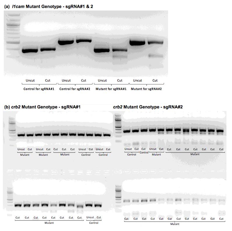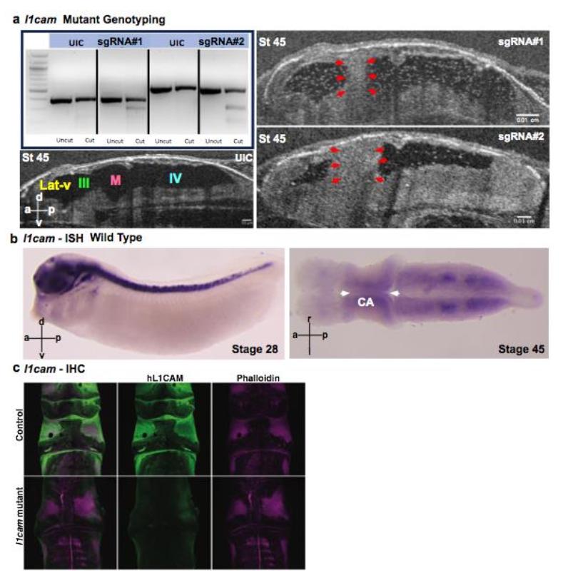 (a) DNA gel showing the PCR product for each l1cam F0 CRISPR mutant and control, before and after cutting with T7 endonuclease I. Mid sagittal OCT image of control and two independent l1cam F0 CRISPR mutants, the later showing stenosis of the cerebral aqueduct (red arrowheads).