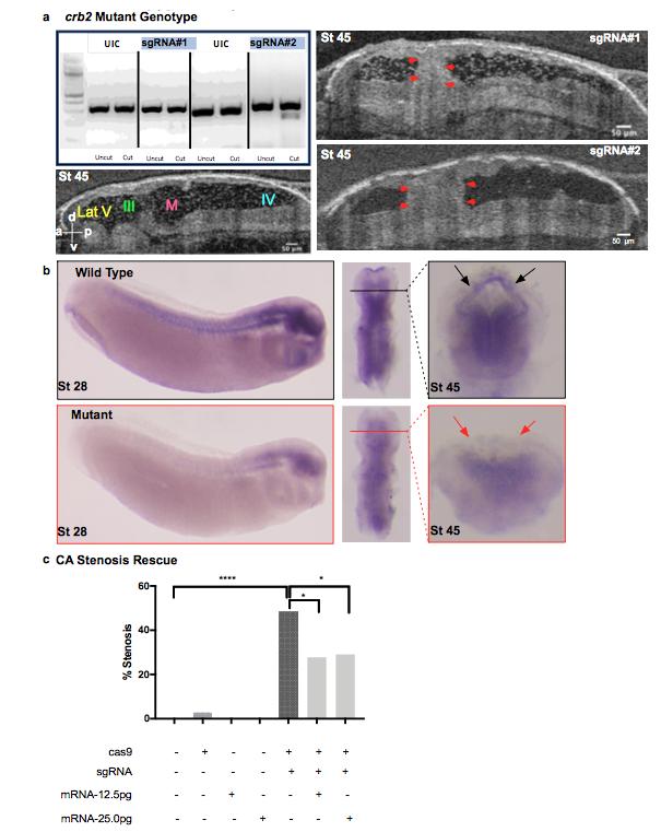 (a) DNA gel showing the PCR product for each crb2 F0 CRISPR mutant and control, before and after cutting with T7 endonuclease I. Mid sagittal OCT image of control and two independent crb2 F0 CRISPR mutants, the later showing stenosis of the cerebral aqueduct (red arrowheads).