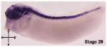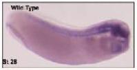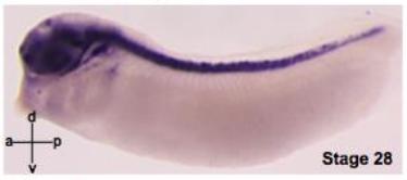 (b) At stage 28 l1cam mRNA expression can be seen in the eye, brain, spinal cord and the notochord using in-situ hybridization. At stage 45 it is weakly expressed in forebrain but a strong expression is seen in the mid and hind brain region.