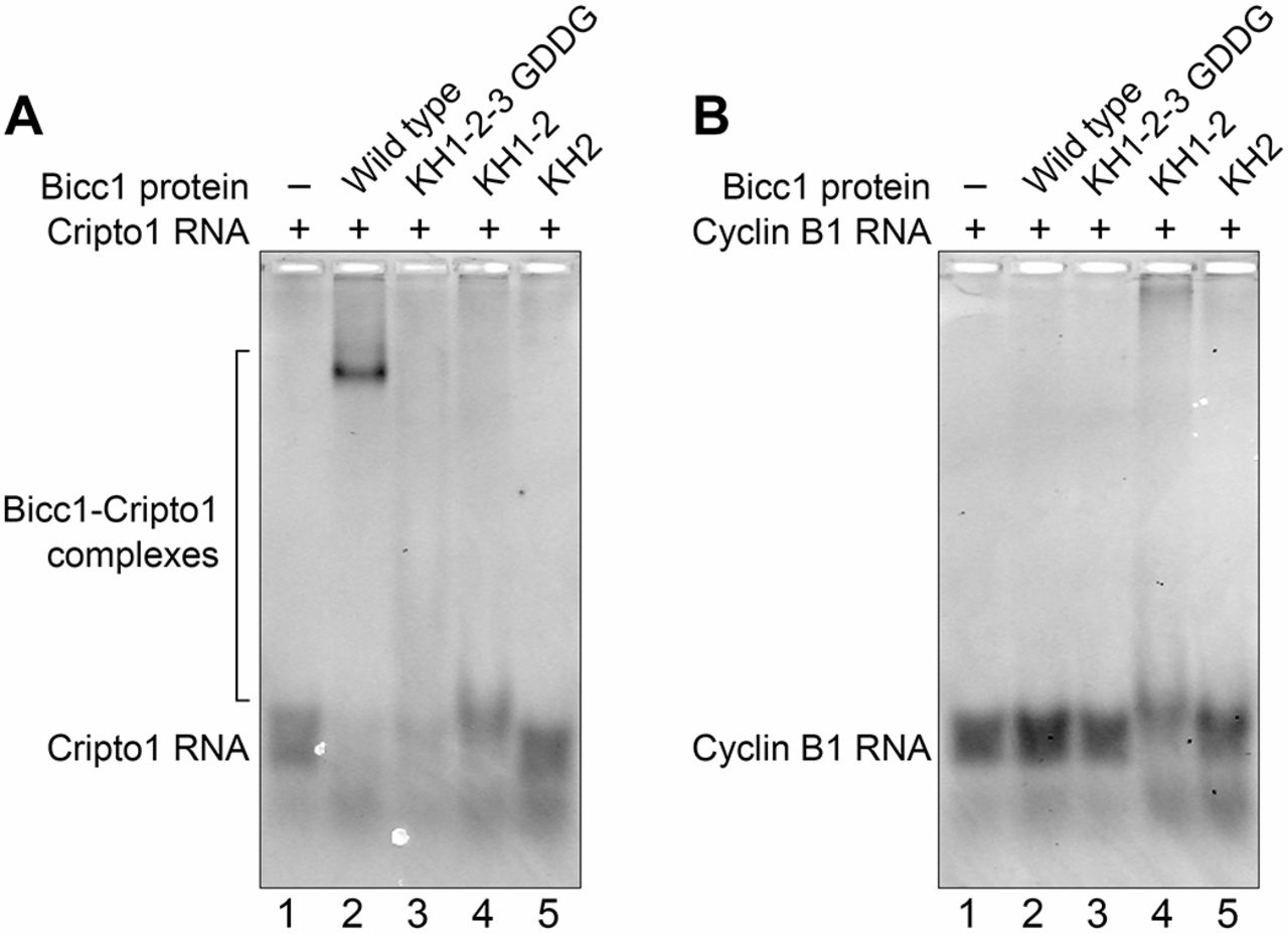 The KH2 domain is not sufficient for RNA binding. (A) Electromobility shift assays of Bicc1 wild-type and protein variants. Recombinant proteins consisting of the Bicc1 wild-type N terminus (amino acids 1-506), the KH1-2-3 GDDG protein (amino acids 1-506), KH1-2 protein (amino acids 41-201) and KH2 protein (amino acids 126-201) were expressed and purified from E.coli. Binding reactions consisting of the different proteins mixed with a fluorescently labeled 32-nucleotide RNA representing a well-characterized Bicc1-binding site derived from the 3â²UTR of the Xenopus Cripto1 mRNA were analyzed on native polyacrylamide gels electrophoresed horizontally (Dowdle et al., 2017). (B) Electromobility shift assays of Bicc1 wild-type and protein variants with an RNA substrate derived from the 3â²UTR of the Xenopus Cyclin B1 mRNA. The Cyclin B1 mRNA is not a Bicc1 target and represents a negative control for binding.