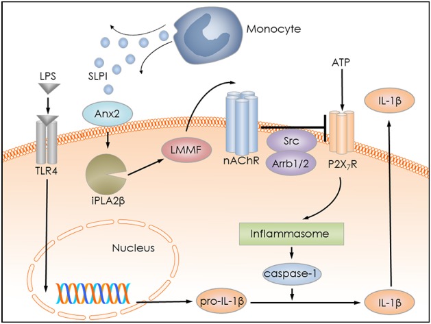 Interleukin-1β (IL-1β) is a potent, pro-inflammatory cytokine of the innate immune system that plays an essential role in host defense against infection. However, elevated circulating levels of IL-1β can cause life-threatening systemic inflammation. Hence, mechanisms controlling IL-1β maturation and release are of outstanding clinical interest. Secretory leukocyte protease inhibitor (SLPI), in addition to its well-described anti-protease function, controls the expression of several pro-inflammatory cytokines on the transcriptional level. In the present study, we tested the potential involvement of SLPI in the control of ATP-induced, inflammasome-dependent IL-1β maturation and release. We demonstrated that SLPI dose-dependently inhibits the ATP-mediated inflammasome activation and IL-1β release in human monocytic cells, without affecting the induction of pro-IL-1β mRNA by LPS. In contrast, the ATP-independent IL-1β release induced by the pore forming bacterial toxin nigericin is not impaired, and SLPI does not directly modulate the ion channel function of the human P2X7 receptor heterologously expressed in Xenopus laevis oocytes. In human monocytic U937 cells, however, SLPI efficiently inhibits ATP-induced ion-currents. Using specific inhibitors and siRNA, we demonstrate that SLPI activates the calcium-independent phospholipase A2β (iPLA2β) and leads to the release of a low molecular mass factor that mediates the inhibition of IL-1β release. Signaling involves nicotinic acetylcholine receptor subunits α7, α9, α10, and Src kinase activation and results in an inhibition of ATP-induced caspase-1 activation. In conclusion, we propose a novel anti-inflammatory mechanism induced by SLPI, which inhibits the ATP-dependent maturation and secretion of IL-1β. This novel signaling pathway might lead to development of therapies that are urgently needed for the prevention and treatment of systemic inflammation.