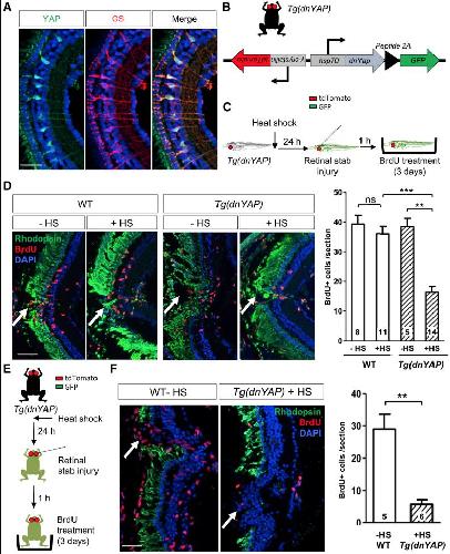 (B) Schematic representation of the heat-shock-inducible dominant-negative Yap transgene (dnYap). Tg(dnYAP) transgenic animals can be selected based on tdTomato expression in the lens (driven by the γ-crystallin promoter). Heat-shocked efficiency can be assessed through GFP expression.