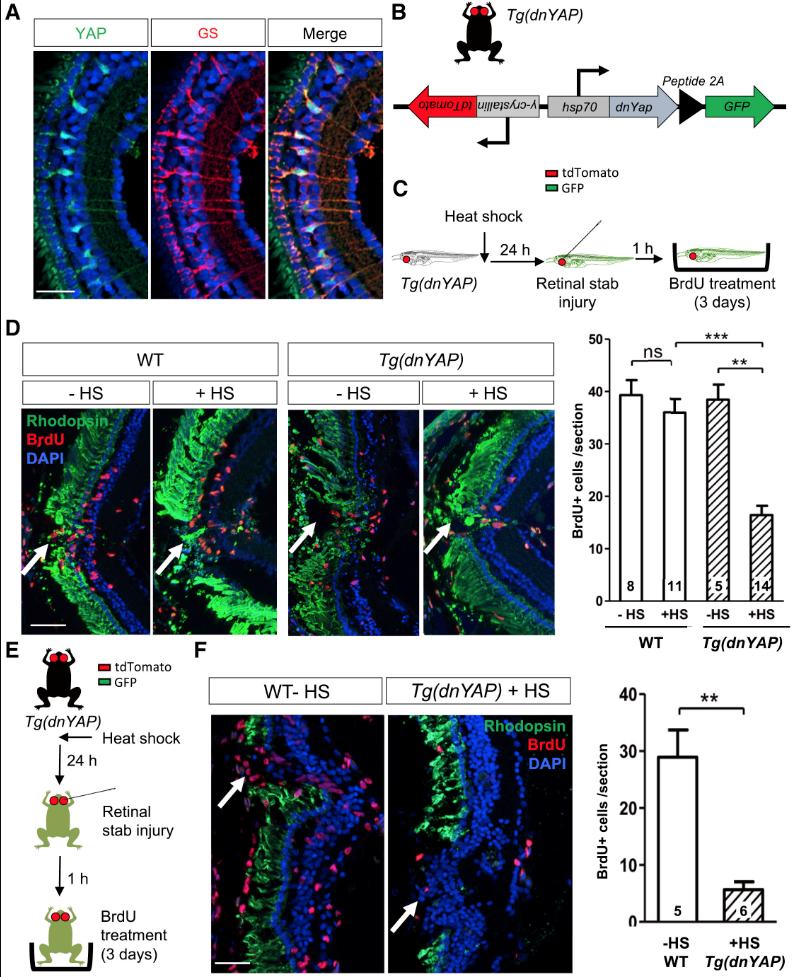 (A) Retinal section from a stage 45 WT Xenopus laevis tadpole, immunostained for YAP and glutamine synthetase (GS; a marker of Müller cells). Nuclei are counterstained with Hoechst (blue).
