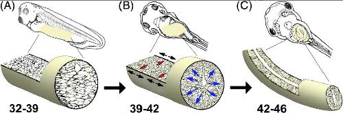 Model of endoderm dynamics during the morphogenesis of the Xenopus primitive gut tube. Between NF32 and NF42 (A,B), the endoderm cells of the prospective midgut gradually elongate and become oriented along the radii of the primitive gut tube. Subsequent radial intercalation (blue arrows in B) facilitates lumen expansion and the morphogenesis of a single‐layered digestive epithelium by NF46. This convergence of the rearranging endoderm also drives longitudinal tissue extension (black arrows in B), as the cells preferentially intercalate between anterior and posterior neighbors within the walls of the gut (red arrows), ultimately facilitating tube narrowing and elongation (C). (Adapted from Reed et al.22)