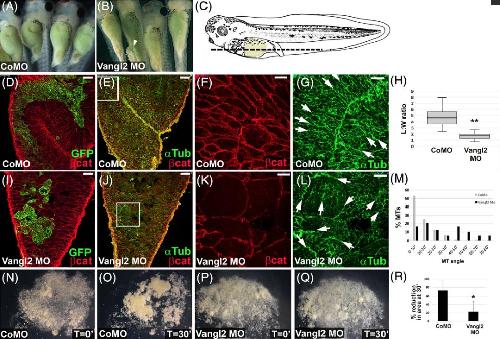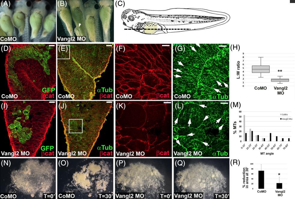 Vangl2 is required early in gut morphogenesis for endoderm cell shape, adhesion, and microtubule organization. Control morpholino (CoMO; A,D‐G,N,O) or Vangl2 morpholino (Vangl2 MO; B,I‐L,P,Q) was co‐injected with mRNA‐encoding GFP (green, D,I) targeting the gut endoderm. Compared to control guts (NF41‐42; A, Vangl2 MO‐injected guts are shorter, straighter, and less cohesive, occasionally with loose cells escaping from the gut tube (arrowhead in B). Transverse sections through injected guts (as indicated by the dashed line in the cartoon, C) were immunostained to reveal cell outlines (red, beta‐catenin, ßcat; D‐F,I‐K) and microtubules (MTs) (green, αTub; E,G,J,L). The boxed region in E is magnified in F,G; the boxed region in J is magnified in K,L. Vangl2 MO‐injected cells exhibit rounder cell shapes, as indicated by decreased length to width (L:W) ratios of individual cells (displayed as box and whiskers plot, H). In addition, ßcat levels in Vangl2 MO‐injected cells (K) are decreased compared to control cells (F). Moreover, whereas MTs in CoMO‐injected cells are oriented parallel to the radial axis of the gut tube (arrows, G), they appear randomly oriented in Vangl2 MO‐injected cells (arrows, L). M: Most MTs in CoMO‐injected cells are distributed within 0° to 20° angle of the apicobasal axis of the epithelium; in contrast, the MTs in Vangl2 MO‐injected cells are distributed more broadly, deviating from parallel. Endoderm cells were dissociated from CoMO‐ (N,O) or Vangl2 MO‐ (P,Q) injected gut tubes, then challenged to reaggregate for 30′ (see Experimental Procedures). While CoMO‐injected cells are able to condense into large clumps of cells that reform adherens junctions (O), Vangl2 MO‐injected cells remain almost completely dissociated (Q). R: The extent of endoderm adhesion is quantified as the percent reduction of the area of the culture dish still covered by loose cells after reaggregation challenge; error bars represent SE. *, P < 0.05; **, P < 0.01. Scale bars D,E,I,J = 75 μM. Scale bars F,G,K,L = 25 μM