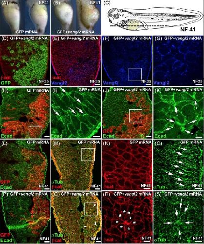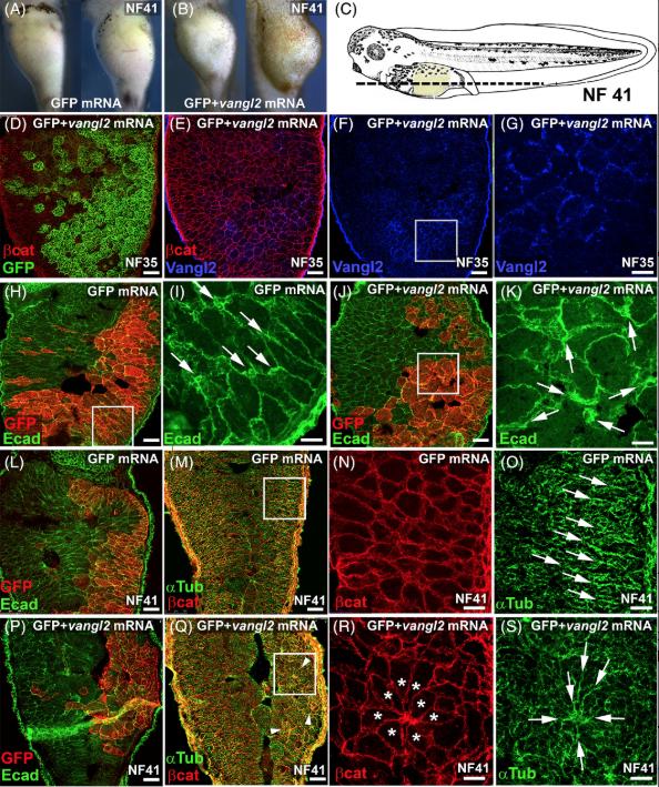 Ectopic Vangl2 expression disrupts tissue‐level endoderm orientation during early gut morphogenesis. Embryos were injected with GFP mRNA alone (A,H,I,L‐O) or GFP plus vangl2 mRNA (B,D‐G,J‐K,P‐S) and allowed to develop to NF35 (D‐G) or NF41 (H‐S). By NF41, the gut tubes of embryos injected with vangl2 mRNA are short and wide, with a bulging topology (B) compared to controls (A). Frontal sections (as exemplified by cartoon diagram, C) were immunostained for the indicated proteins at either NF35 (D‐G) or NF41 (H‐S). The boxed regions in F,H,J,M, and Q are magnified in G,I,K,N‐O, and R‐S, respectively. At NF35, vangl2 mRNA‐injected endoderm cells, indicated by GFP expression (green in D), exhibit ectopic Vangl2 localization at the membrane (E‐G) compared to neighboring uninjected cells. By NF41‐NF42, GFP mRNA‐injected cells (red in H and L) are uniformly radially oriented, with apically enriched E‐cadherin (I) and parallel arrays of microtubules (arrows, O). In contrast, vangl2 mRNA‐injected cells (red in J and P) are not aligned with respect to the gut axes, exhibit variably localized E‐cadherin (K) and beta‐catenin (R), and form unusual tissue‐level configurations, including rosettes (marked by arrowheads in Q, asterisks in R; arrows in S indicate abnormal microtubule orientations). Scale bars D‐F,H,J,L,M,P,Q = 75 μM. Scale bars G,I,K,N,O,R,S = 25 μM