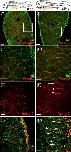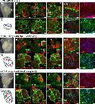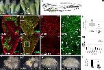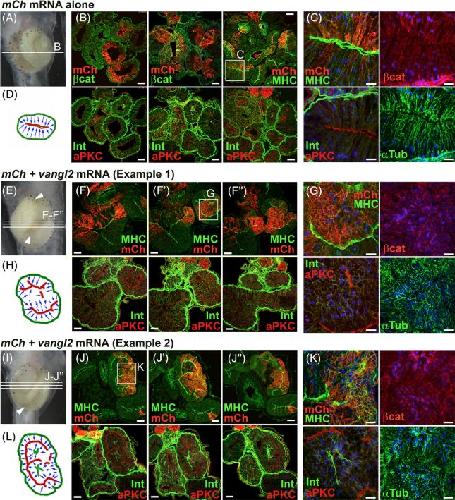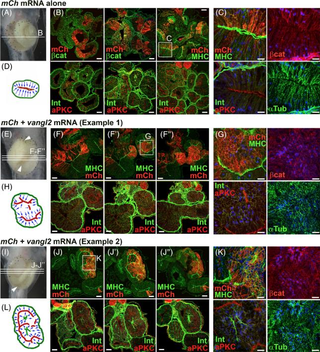 Ectopic Vangl2 expression disrupts tissue‐level gut epithelial organization. Embryos were injected with mCherry (mCh) mRNA alone (A‐C) or mCherry plus vangl2 mRNA (two examples in E‐G and I‐K, respectively) to target the prospective gut tube and allowed to develop to NF46. Compared to the long, rotated guts of control embryos injected with mCh mRNA alone (A), the gut tubes of embryos injected with vangl2 mRNA (E,I) are shorter and wider than controls and often have unusual bulges and/or indentations (arrowheads in E,I). To analyze tissue architecture in injected embryos, transverse sections (eg, section plane approximated by horizontal line in A) were immunostained for various proteins, as indicated: beta‐catenin (ßcat; green) to reveal cell shape/adhesion; aPKC (red) or MHC (green) to reveal the apical/lumenal cell surface; and integrin (Int, green), which is enriched at basement membranes. Serial sections from the same embryo are shown sequentially in F‐F″ and J‐J”, with section planes approximated by the horizontal lines in E and I, respectively. B: In controls, the segments of the gut tube are comprised of a central lumen surrounded by a single layer of apicobasally polarized epithelium, as summarized in the cartoon (D; blue arrows represent the orientation of cell polarity with respect to basement membrane [green] and apical surface [red]). C: Higher‐magnification views (from serial sections) of the boxed region in B reveal uniform basolateral distribution of beta‐catenin, apically localized MHC/aPKC, and parallel arrays of apically nucleated microtubules (as indicated by αTub). F‐F″: In contrast to controls, the segments of a vangl2 mRNA‐injected gut appear thickened, with walls composed of multiple layers of disoriented epithelial tissue forming a torturous, branching, and/or noncontiguous lumen, as exemplified in the cartoon (H). G: Higher‐magnification views (from serial sections) of the boxed region in F′ reveal that vangl2 mRNA‐overexpressing cells retain beta‐catenin expression, although microtubule bundles are often short and/or obliquely oriented, consistent with the complex, multilayered epithelial organization created by the noncontiguous apical/lumenal surface delineated by MHC/aPKC. J‐J”: In another vangl2 mRNA‐injected gut, basement membrane, as indicated by Int expression, is detected internally, as represented in the cartoon (L). K: Higher‐magnification views (from serial sections) of the boxed region in J show both the discontinuous apical/lumenal surface (indicated by MHC/aPKC expression) and presumed basement membrane (Int) in the center of the gut tube, revealing the perturbed polarity of epithelial organization in the context of Vangl2 overexpression. Nuclei, TO‐PRO‐3 (blue). Scale bars B,F‐F″,J‐J” = 75 μM. Scale bars C,G,K = 25 μM