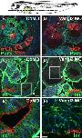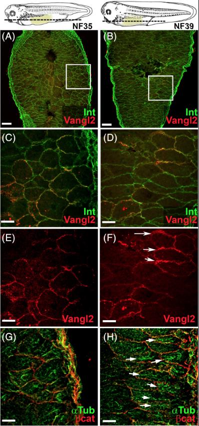 Vangl2 localization becomes apically and anteriorly polarized during Xenopus gut morphogenesis. Low levels of Vangl2 mRNA were targeted to the gut endoderm to generate mosaic overexpression (see Experimental Procedures). Injected embryos (NF35 and NF39) were then sectioned frontally (as indicated by the dashed line in the cartoons) and immunostained to detect integrin (Int, green cell outlines, A‐F), Vangl2 (red, A‐F), beta‐catenin (ß‐cat; red, G,H) and/or alpha‐tubulin (αTub; green, G,H). The boxed region in A is magnified in C and E; the boxed region in B is magnified in D and F. At NF35, Vangl2 (red) is localized in puncta throughout endoderm cell membranes (A,C,E); the disorganized (nonparallel) microtubule architecture at this stage (G) indicates endoderm cells are still largely unpolarized. However, by NF39 (B,D,F), when cells are elongating along the radial axis of the gut tube and the parallel alignment of microtubule bundles reveals the cells' radial polarization (arrows, H), Vangl2 has become localized predominately at the apical (left) end and anterior (top) face of each cell (arrows, F). Scale bars A,B = 75 μM. Scale bars C‐H = 25 μM