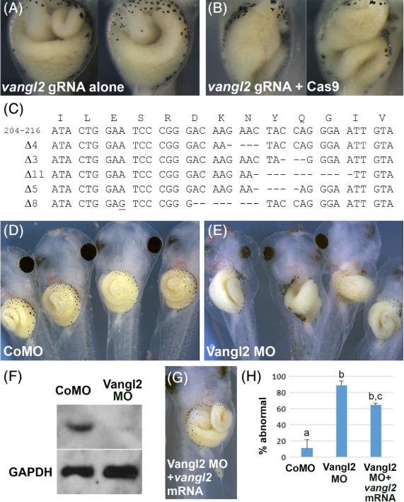 Endoderm‐specific knockdown of Vangl2 activity causes gut morphogenesis defects. While the gut has substantially elongated in control embryos injected with vangl2 gRNA alone (A; NF44), embryos injected with vangl2 gRNA plus Cas9 mRNA (B; NF44) are severely shortened and/or malrotated, correlating with indels at the vangl2 locus on both L (Δ4, Δ3, Δ11, Δ5) and S (Δ8) chromosomes. Likewise, while embryos injected with control morpholino (CoMO; D; NF46) develop long, coiled gut tubes, embryos injected with Vangl2 morpholino (Vangl2 MO) have abnormally short and malrotated guts (E). F: Western blotting for Xenopus Vangl2 protein confirms that Vangl2 is depleted in Vangl2 MO‐injected embryos, compared to CoMO‐injected controls (NF41); GAPDH was detected as a loading control. G‐H: Co‐injection of Vangl2 MO with a morpholino‐resistant WT vangl2 mRNA partially rescues the short gut phenotype (compare to E). H: Annotations (a,b,c) indicate injected groups significantly different from each other P < 0.05. (Error bars indicate SD)