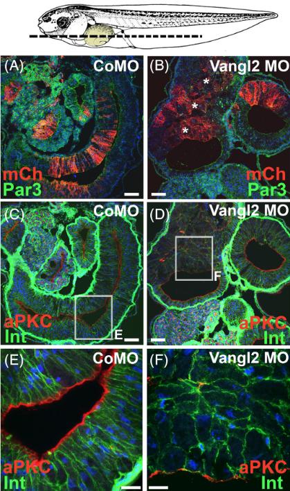 Vangl2 is required for gut lumen formation and apicobasal polarity. Embryos were injected with CoMO (A,C,E) or Vangl2 MO (B,D,F) plus mRNA‐encoding mCherry (mCh, red in A,B; as a lineage tracer) targeting the gut endoderm. Frontal sections (as indicated by the dashed line in the cartoon diagram, NF46) were immunostained for apical (Par3, green in A,B; aPKC, red in C‐F) and basolateral (integrin, Int, green in C‐F) proteins to reveal cell polarity. Boxed regions in C and D are magnified in E and F, respectively. Unlike controls (A,C), Vangl2 MO‐injected guts do not form a central lumen; the unintercalated cells (asterisks in B; boxed region in D) exhibit abnormally rounded shapes and decreased apical markers (eg, aPKC; F) compared to controls (E). Nuclei, TO‐PRO‐3 (blue). Scale bars A‐D = 75 μM. Scale bars E,F = 25 μM