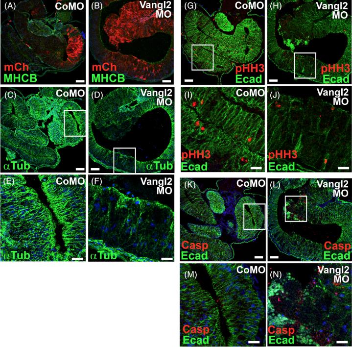 Vangl2 is required during late gut morphogenesis for epithelial polarity and microtubule architecture. Embryos were injected with control morpholino (CoMO; A,C,E,G,I,K,M) or Vangl2 MO (B,D,F,H,J,L,N) plus mRNA‐encoding mCherry (mCh, red in A,B; as a lineage tracer) targeting the gut endoderm. Frontal sections (NF46) were immunostained for the apical marker MHCB (green in A,B), alpha‐tubulin (αTub, green in C‐F, to reveal microtubule architecture), and E‐cadherin (Ecad, green in G‐N, to outline cell surfaces and reveal adherens junctions). Boxed regions in C,D,G,H,K, and L are magnified in E,F,I,J,M, and N, respectively. Unlike controls (E), Vangl2 MO‐injected cells are unable to form properly oriented microtubule arrays (F). Likewise, intercellular adhesion is reduced dramatically in Vangl2 morphants (compare Ecad staining in I,J). Immunostaining for the mitotic marker phosphohistone H3 (pHH3, red in G‐J) suggests that the abnormal epithelial morphogenesis observed in Vangl2‐deficient guts is independent of early cell inviability. However, immunostaining for activated caspase (Casp, red in K‐N) shows that unintercalated cells in the Vangl2‐deficient gut lumen eventually die by apoptosis (L,N), an event rarely observed in controls (K,M). Nuclei, TO‐PRO‐3 (blue). Scale bars in A‐D,G,H,K,L = 75 μM; E,F,I,J,M,N = 25 μM