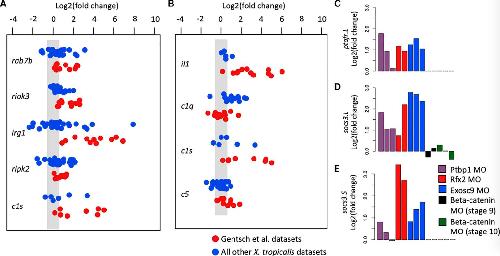It has recently been reported that a common side effect of translation-blocking morpholino antisense oligonucleotides is the induction of a set of innate immune response genes in Xenopus embryos and that splicing-blocking morpholinos lead to unexpected off-target mis-splicing events. Here, we present an analysis of all publicly available Xenopus RNA sequencing (RNA-seq) data in a reexamination of the effects of translation-blocking morpholinos on the innate immune response. Our analysis does not support the authors' general conclusion, which was based on a limited number of RNA-seq datasets. Moreover, the strong induction of an immune response appears to be specific to the tbxt/tbxt2 morpholinos. The more comprehensive study presented here indicates that using morpholinos for targeted gene knockdowns remains of considerable value for the rapid identification of gene function.