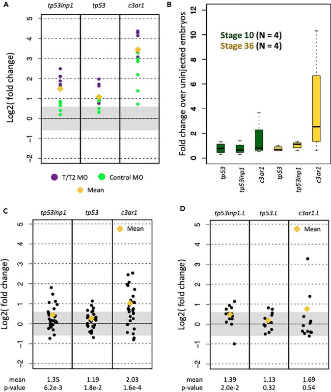 (B) Fold change caused by control MO in biological replicates at stages 10 and 36 using RT-qPCR.
