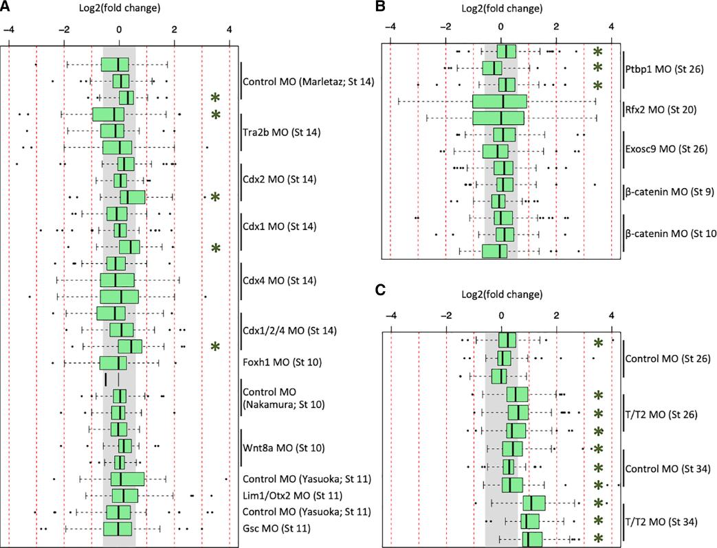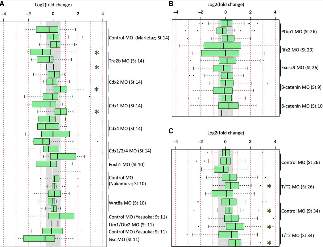 (A–C) Fold-change expression of innate immune response genes across 29 datasets in X. tropicalis (A), across 13 datasets in X. laevis (B), and in 12 of the tbxt/t2 MO datasets (C). The gray region indicates fold change of <1.5×. Green asterisk (∗) indicates a t test p value of <0.01.